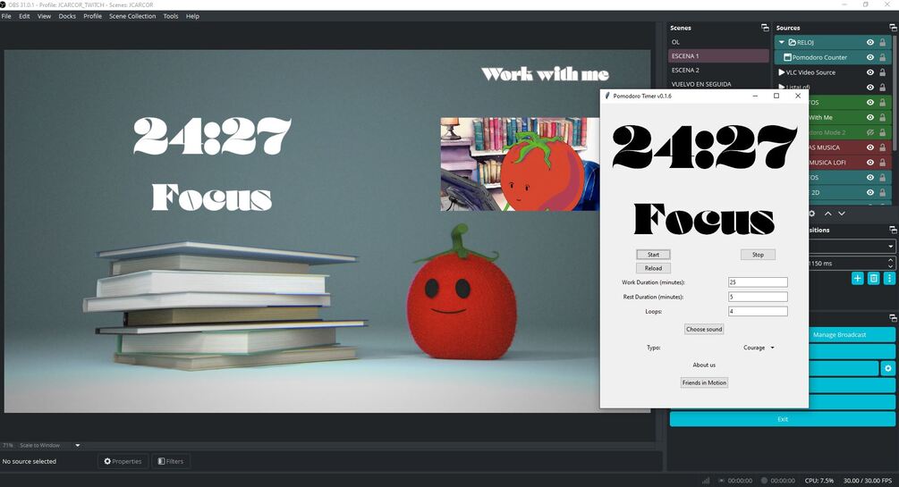 Pomodoro Timer is a Python-based app built using pygame. Designed specifically for streamers, this timer helps you implement the Pomodoro technique, balancing work and rest sessions while keeping your audience engaged and motivated.